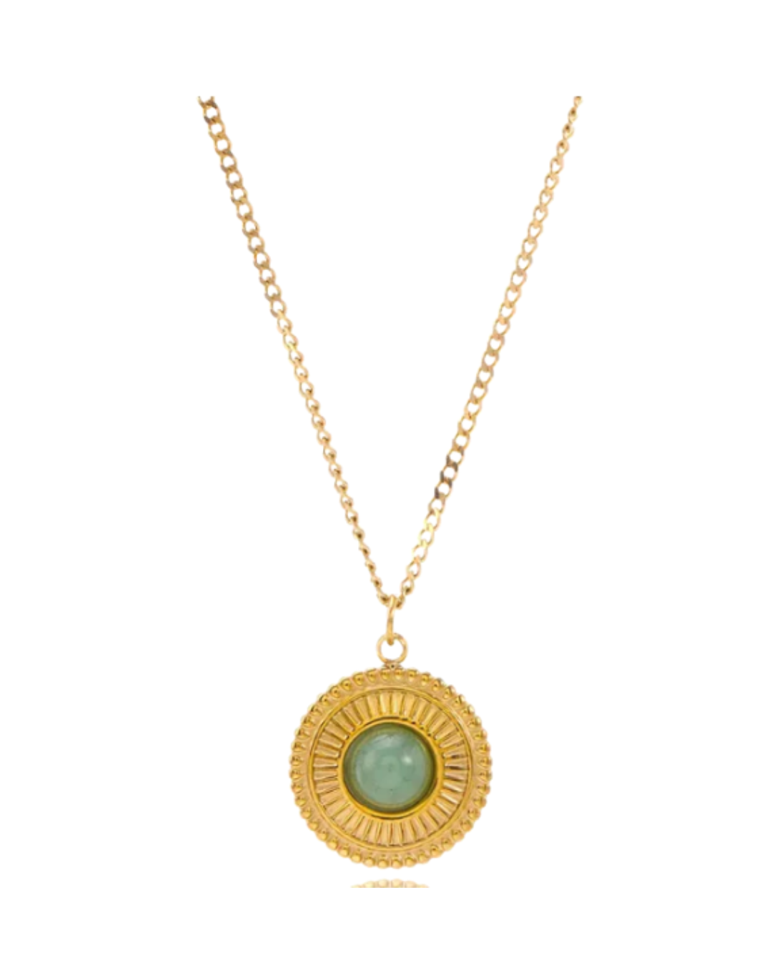 Este collar con piedra Aventurina está hecho de Acero Inoxidable chapado en oro 18 quilates. Por ser una piedra natural la coloración puede variar entre turquesa o verde, le da un toque único y especial. Un accesorio distintivo entre todos.