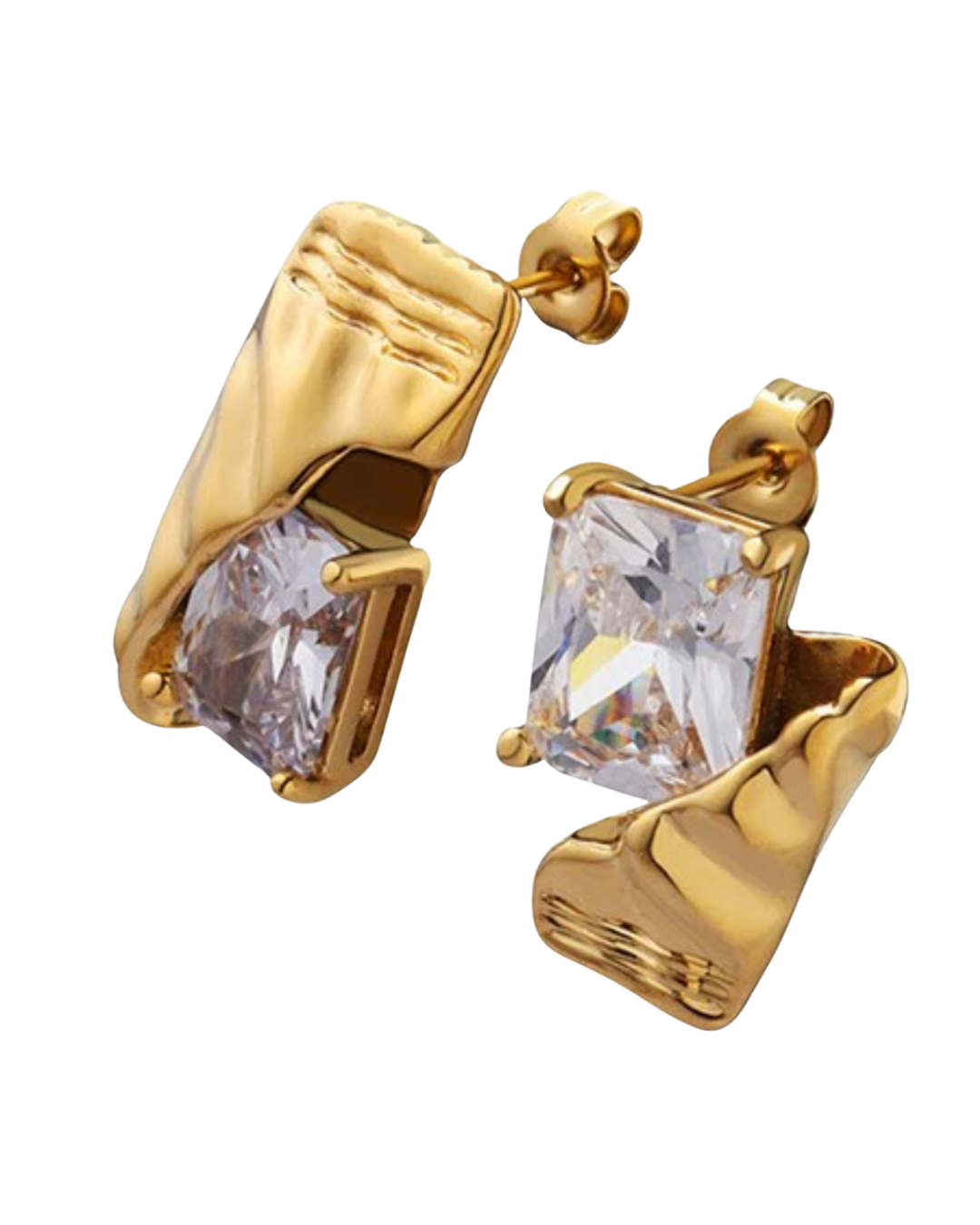 Estos aretes de diseño irregular con aplicación de Zirconias claras serán tus nuevos favoritos. Hechos de Acero Inoxidable chapado en oro, estos aretes son una combinación perfecta de lujo y durabilidad.