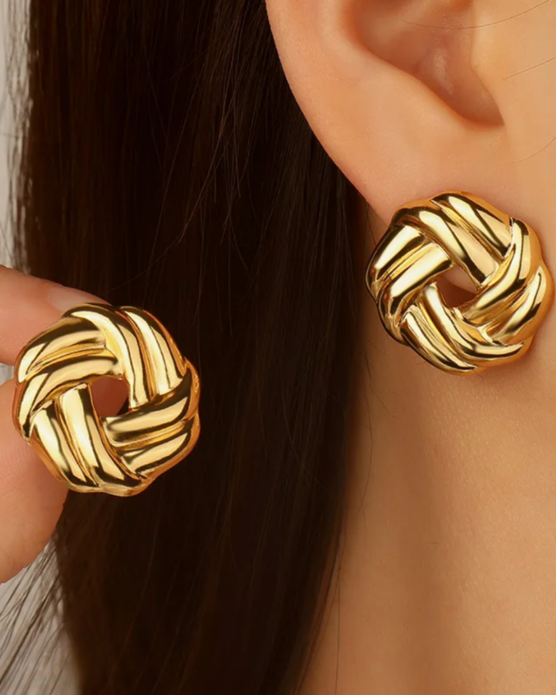 Aretes de diseño de entrelazado creados de acero inoxidable ofreciendo un look chic y sofisticado que marcan tu presencia.