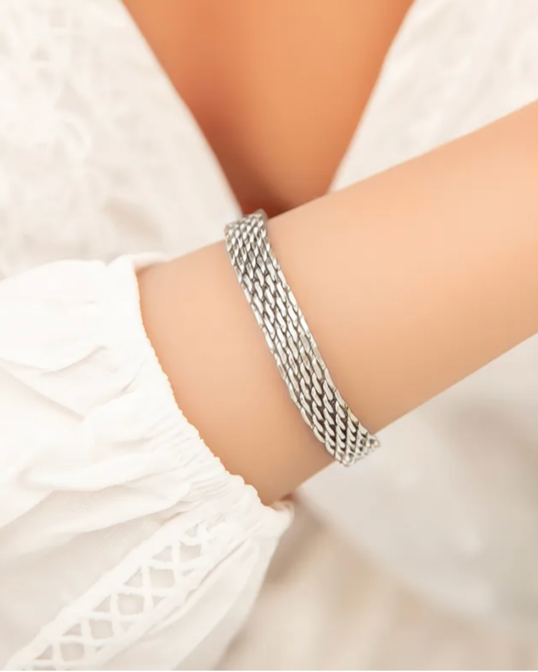 Brazalete de lujo confeccionado en una estructura gruesa al mismo tiempo que abraza la elegancia y resistencia que permite el acero inoxidable.