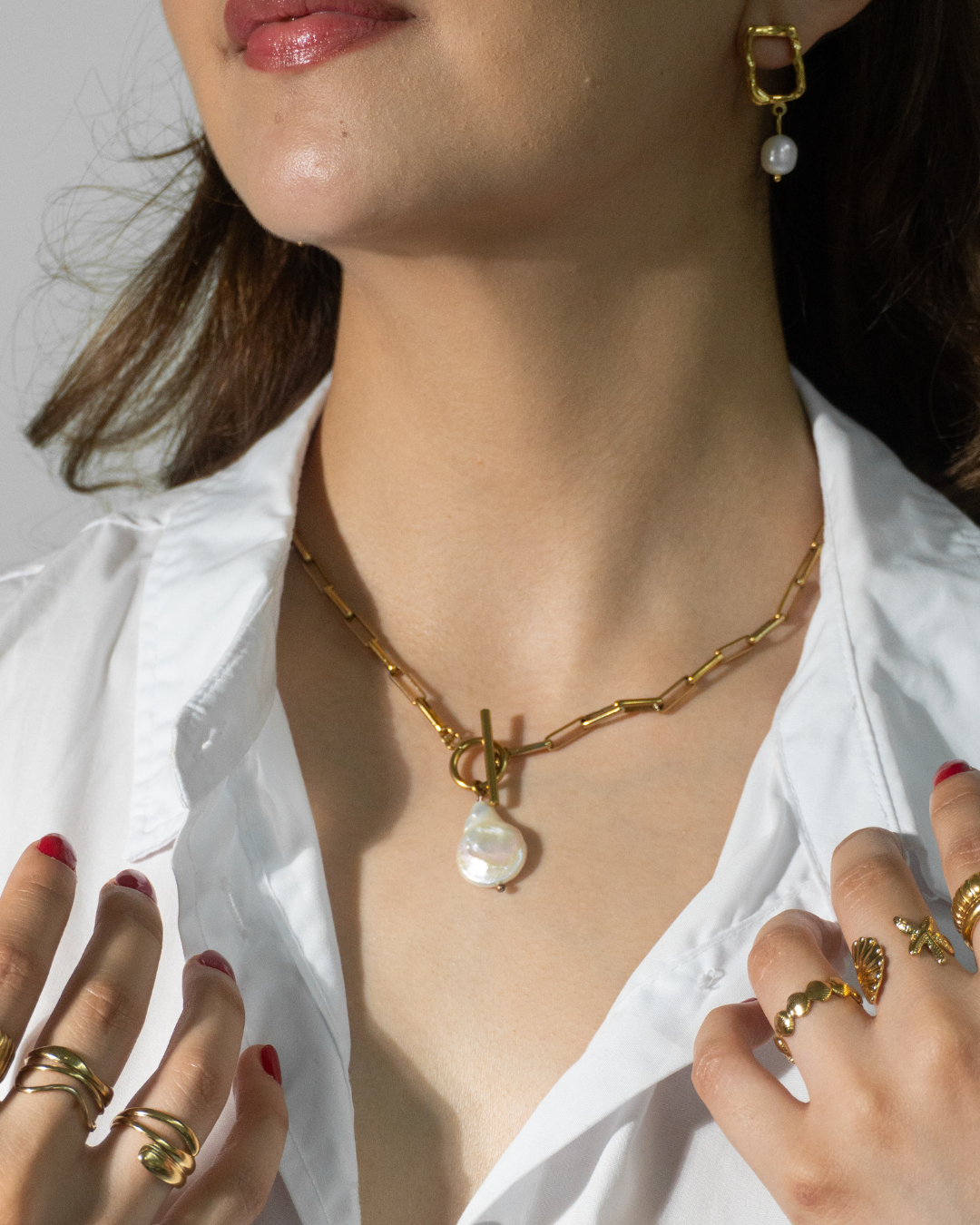 Collar con Perla de rio irregular, hecho de Acero inoxidable.