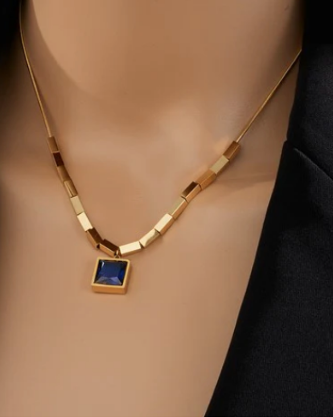 Este collar con incrustación en cristal azul es una verdadera joya de acero inoxidable chapado en oro de 18 quilates. Su diseño delicado y elegante es ideal para cualquier ocasión. ¡Luce el tuyo de la mejor manera!