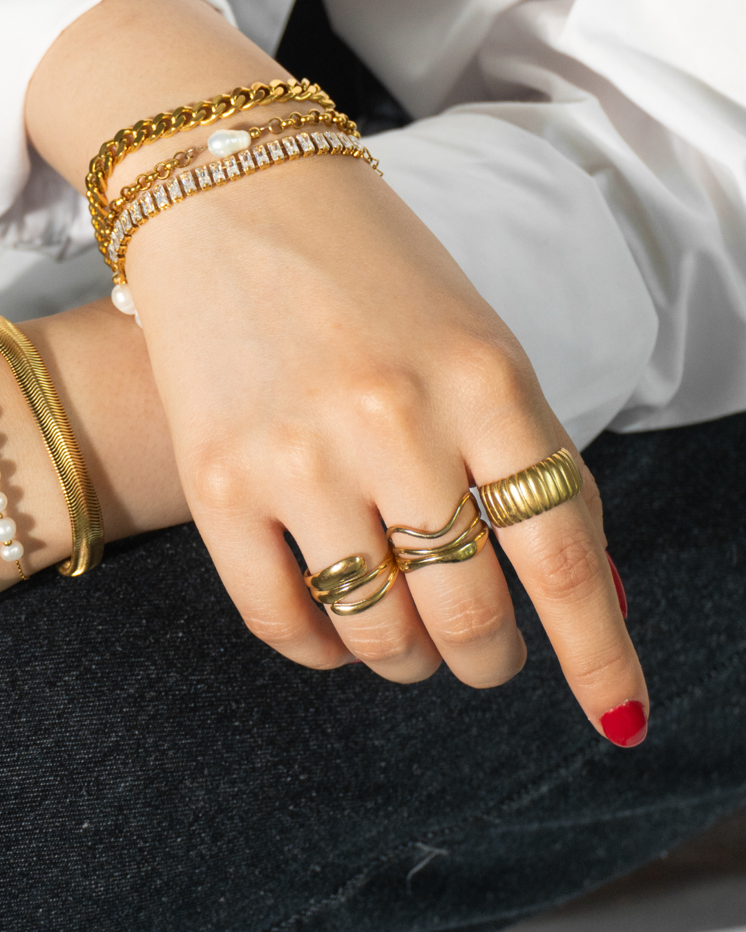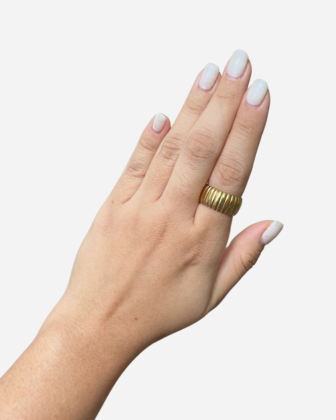 Anillo abierto creado de acero inoxidable con chapado en oro de 18K con efecto chunky texturizado es el complemento perfecto para cualquier outfit de temporada.